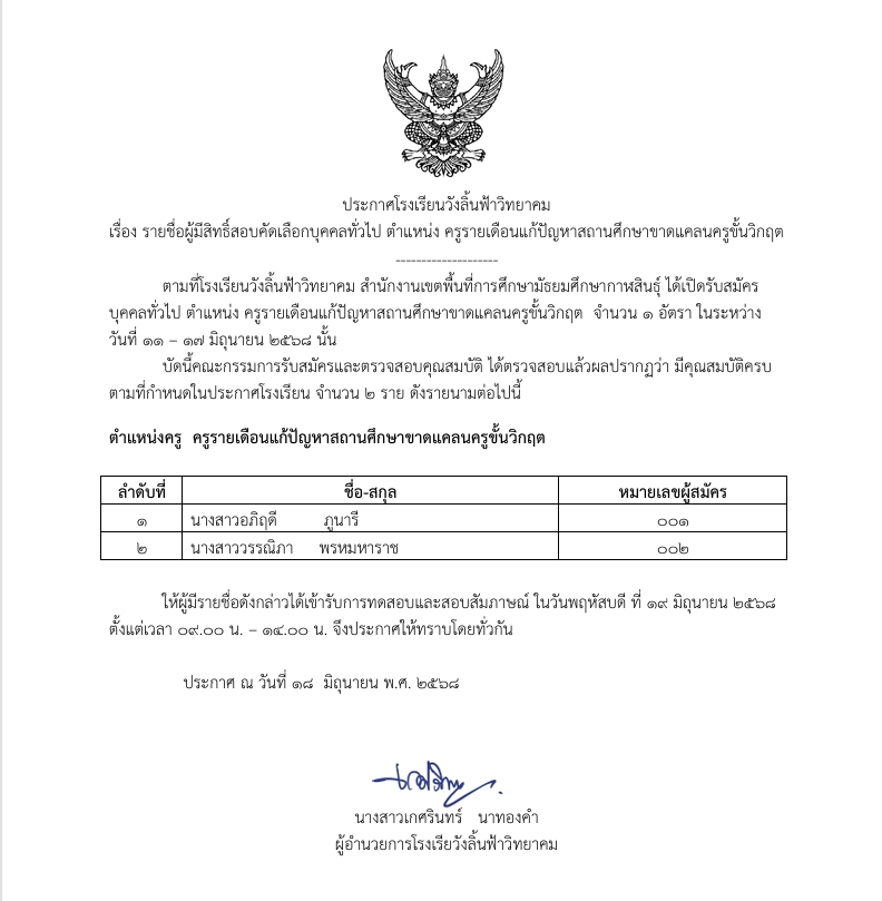 รายชื่อผู้มีสิทธิ์สอบคัดเลือกบุคคลทั่วไป ตำแหน่ง ครูรายเดือนแก้ปัญหาสถานศึกษาขาดแคลนครูขั้นวิกฤต