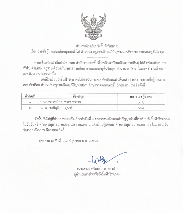 รายชื่อผู้ผ่านคัดเลือกบุคคลทั่วไป ตำแหน่งครูรายเดือน